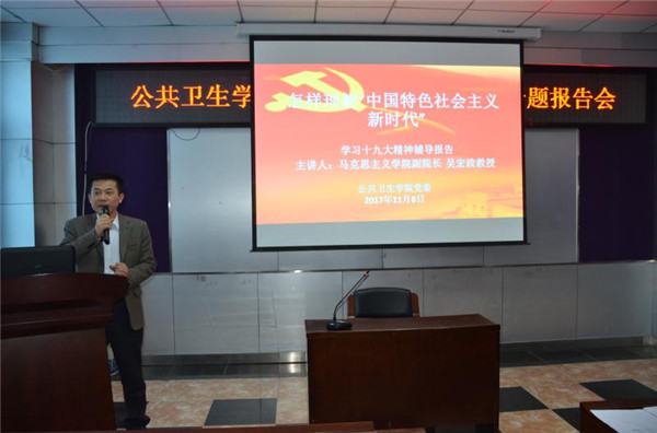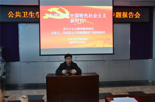 为深入学习贯彻党的十九大精神, 2017年11月8日下午,公共卫生学院党委邀请了“吉林大学党的十九大精神宣讲团”成员、马克思主义学院副院长吴宏政教授为学院全体党员做了题为《怎样理解“中国特色社会主义进入新时代”》的专题学习辅导报告。学院领导班子成员、党委委员、党支部书记、教工党员、民主党派和无党派人士参加了报告会,会议由学院党委书记赵国利主持。