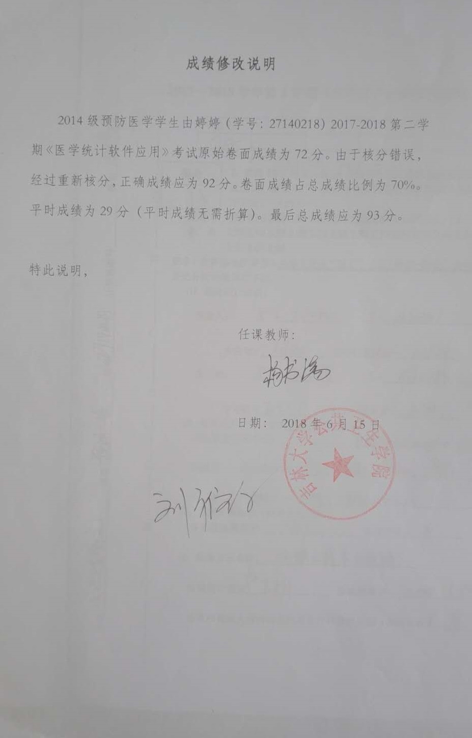 学院2014级由婷婷同学(27140218)2017-2018-2《医学统计软件应用》成绩更正如下: