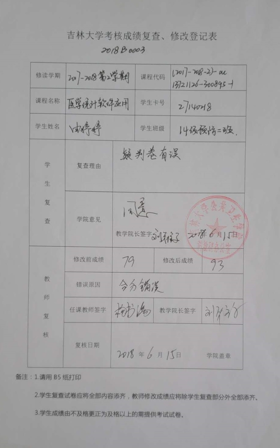 1.由婷婷同学本科课程考核成绩更正申请审批表