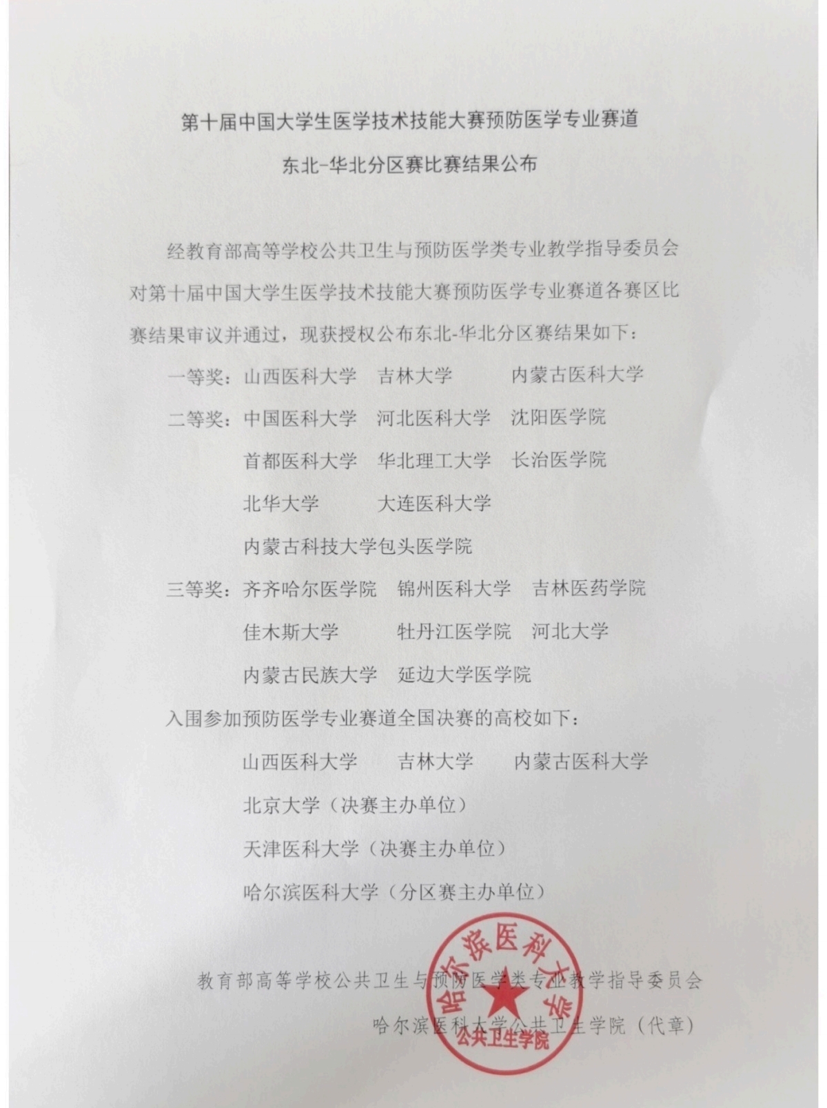 为全面贯彻全国教育大会、全国卫生与健康大会及全国中医药大会精神,落实《国务院办公厅关于加快医学教育创新发展的指导意见》(国办发[2020]34号)要求,推动公共卫生与预防医学实践教学改革和创新实践教学体系,加强预防医学教学队伍建设,全面提升公共卫生与预防医学人才综合素质和培养质量,教育部办公厅下发《教育部办公厅关于举办第十届中国大学生医学技术技能大赛的通知》,在全国范围内开展第十届中国大学生医学技术技能大赛,设临床医学五年制、临床医学八年制、中医学、预防医学和护理学五个赛道。本次比赛分为初赛和决赛两个阶段,4月10日我院代表吉林大学参加了预防医学赛道东北-华北分区赛。