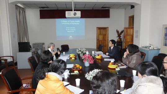在吉林大学举办美国肯塔基大学活动周之际,日韩av 邀请肯塔基大学副教务长Susan Karvalhol来学院座谈,洽谈两校合作办学相关事宜。学院主管外事工作副院长、博士生导师刘晓冬教授主持会议,学院相关科室主任和青年教师参加座谈。在友好气氛中,双方就合作办学专业、模式、学生管理、学费及收取、课程互认、教师交流等多项事宜达成共识,并约定在5月份的第二次会谈中签署相关协议,日韩av 有望成为吉林大学与肯塔基大学之间学院合作的第一个战略伙伴。