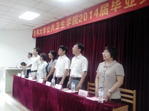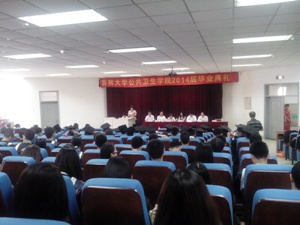 毕业典礼在庄严的国歌声中拉开帷幕。首先,副院长刘雅文宣读2014届本科毕业生、硕士毕业生和博士毕业生名单,由刘晓冬副院长宣读2014届优秀本科毕业生名单、优秀研究生毕业名单。在欢快的《进行曲》中,屈英和书记和钟绍峰书记分别为获奖毕业生同学颁发荣誉证书。接着,院长、院学位委员会主席李娟教授和刘娅教授为毕业生颁发毕业证书并授予学位。随后,本科生代表及研究生代表发言,他们回顾了在母校生活的点点滴滴,言语中无不显露出对母校、对学院及各位领导老师的感激之情,表示会用实际行动践行公卫精神,衷心祝愿母校、学院的明天更加灿烂辉煌。之后,学生朋辈心理辅导员同学及学弟学妹代表向毕业生赠送祝福小礼物,2014届全体毕业生向母校赠送纪念品,表达对母校深深的感激之情。接着,由儿少卫生学教研室主任梅松丽教授代表教师发言,她表示,学院各位老师会一如既往的关注、关心、关爱全体毕业生,她对2014届毕业生寄语殷切的期望,希望全体毕业生在以后的工作生活中脚踏实地,努力拼搏,勇往直前。最后,李娟院长讲话,她希望毕业生们在未来路上诚实守信,关爱健康,为自己的未来努力奋斗,为母校的荣誉努力奋斗。亲切的话语表达了对毕业生今后不懈努力和追求去实现人生的美好梦想的殷切希望。并希望同学们在毕业后能与母校保持联系,为母校的发展贡献自己的力量。