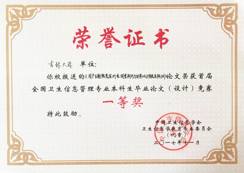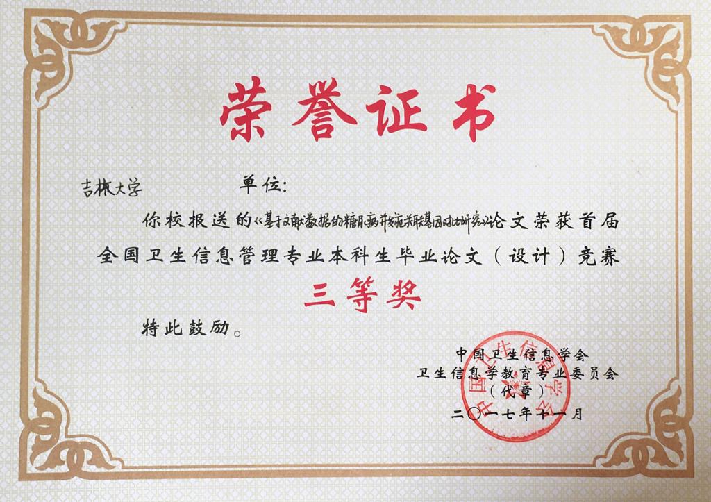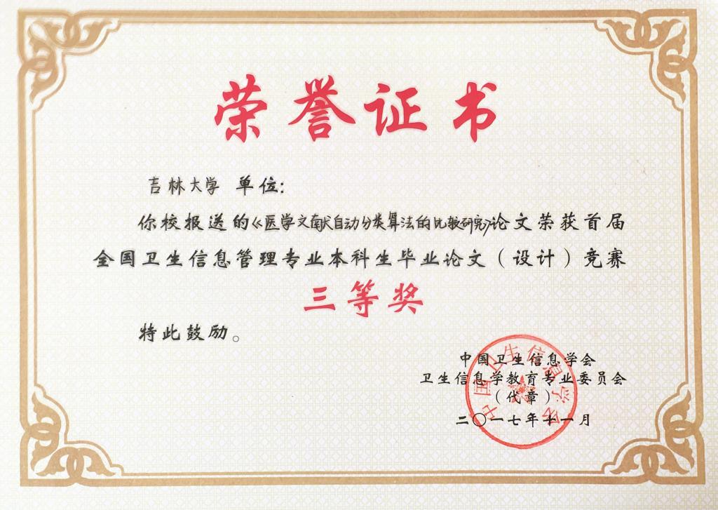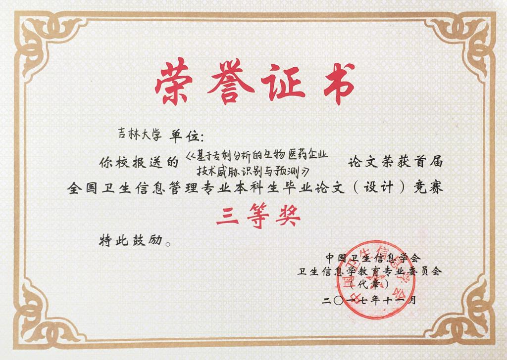 吉林大学、华中科技大学、中南大学、中国医科大学、山西医科大学、重庆医科大学、广西医科大学、广东医科大学、南通大学、河北北方学院、徐州医学院、滨州医学院、济宁医学院、新乡医学院、湖北医药学院、成都医学院等院校共报送参赛论文作品69篇。经本次竞赛专家委员会匿名评审,共有31篇论文获奖,其中一等奖论文6篇、二等论文10篇、三等奖论文15篇。根据竞赛规则,我院从2017届信息管理与信息系统(医药信息管理)专业本科毕业论文中选送参赛论文9篇,其中《用户主题熟悉度对查询重构行为的影响及熟悉度预测》(刘强,指导教师:孙丽副教授)获本次竞赛一等奖;《基于专利分析的生物医药企业技术威胁识别与预测》(李芳芳,指导教师:王伟教授)、《医学文献自动分类算法的比较研究》(张雅鑫,指导教师:张云秋教授)、《基于文献数据的糖尿病并发症关联基因对比研究》(金姗,指导教师:牟冬梅教授)分别获得本次竞赛三等奖,获奖论文数量位列参赛各院校首位,比较客观地反映了我院本科教学取得的成果。