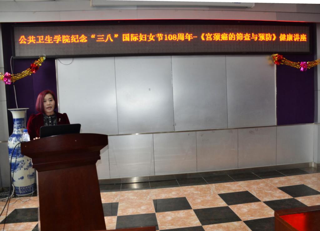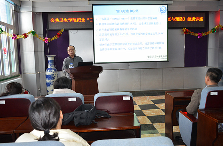 院长刘雅文,党委书记赵国利参加此次活动。学院党委副书记兼副院长、妇委会主任刘丽主持了本次讲座。讲座聘请吉林大学第一医院妇产科主任、吉林省妇产科疑难病诊断专家温岩教授,为大家讲授了题目为《宫颈癌的筛查与防治》的相关内容。学院的许多女老师和女学生都参加了讲座。