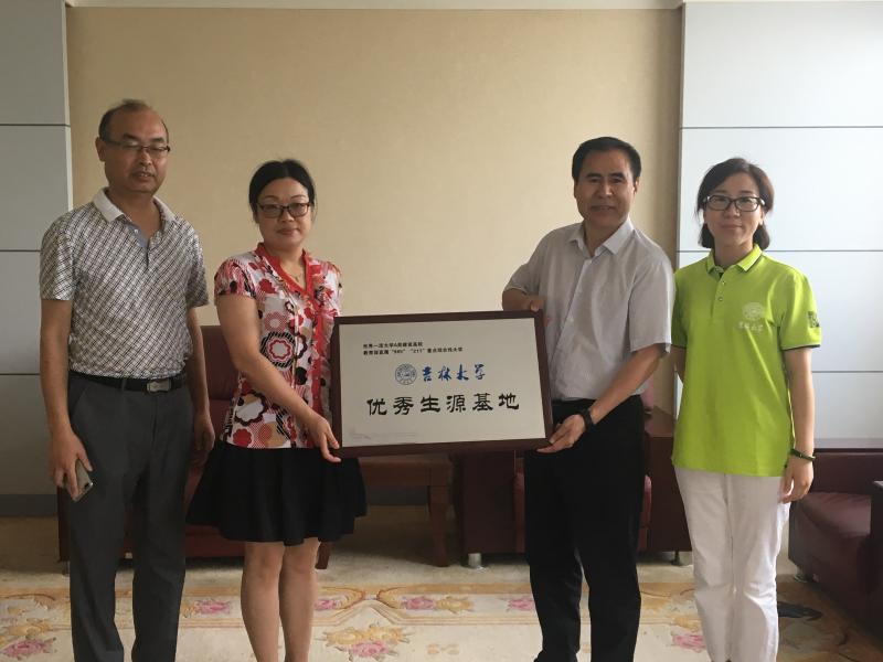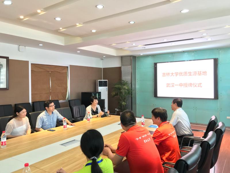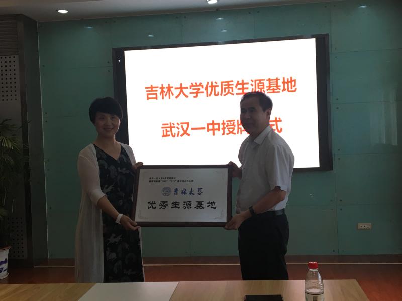 副院长于洗河首先就吉林大学进行了介绍,并积极欢迎武汉市第一中学的优秀学子报考吉林大学。武汉市第一中学副校长库路对学校概况和生源情况进行了简要介绍,并欢迎吉林大学的优秀师生来武汉市第一中学开展科普讲座,希望两校之间加强沟通和联系、增进彼此了解。会后,双方举行了“优秀生源基地”授牌仪式。