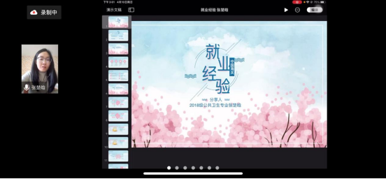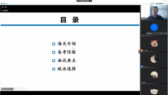 于4月10日下午在线上开展了“‘职’无不言” 系列就业指导活动之校友海关应聘经验分享会。本次活动邀请了毕业校友2018级公共卫生专业硕士张楚晗和谭启跃作为主讲人。研究生辅导员丁丁和部分研究生、本科生同学参加此次活动。