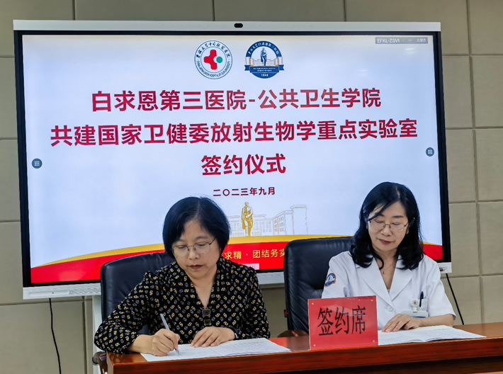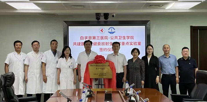 与白求恩第三医院共同举行共建“吉林大学国家卫健委放射生物学重点实验室”签约仪式。我院党委书记赵国利、院长刘雅文、白求恩第三医院党委书记崔树森、院长刘林林、副院长高宇飞、重点实验室主任马庆杰、副主任申延男、放射医学系主任金顺子以及相关领导参加了签约仪式。